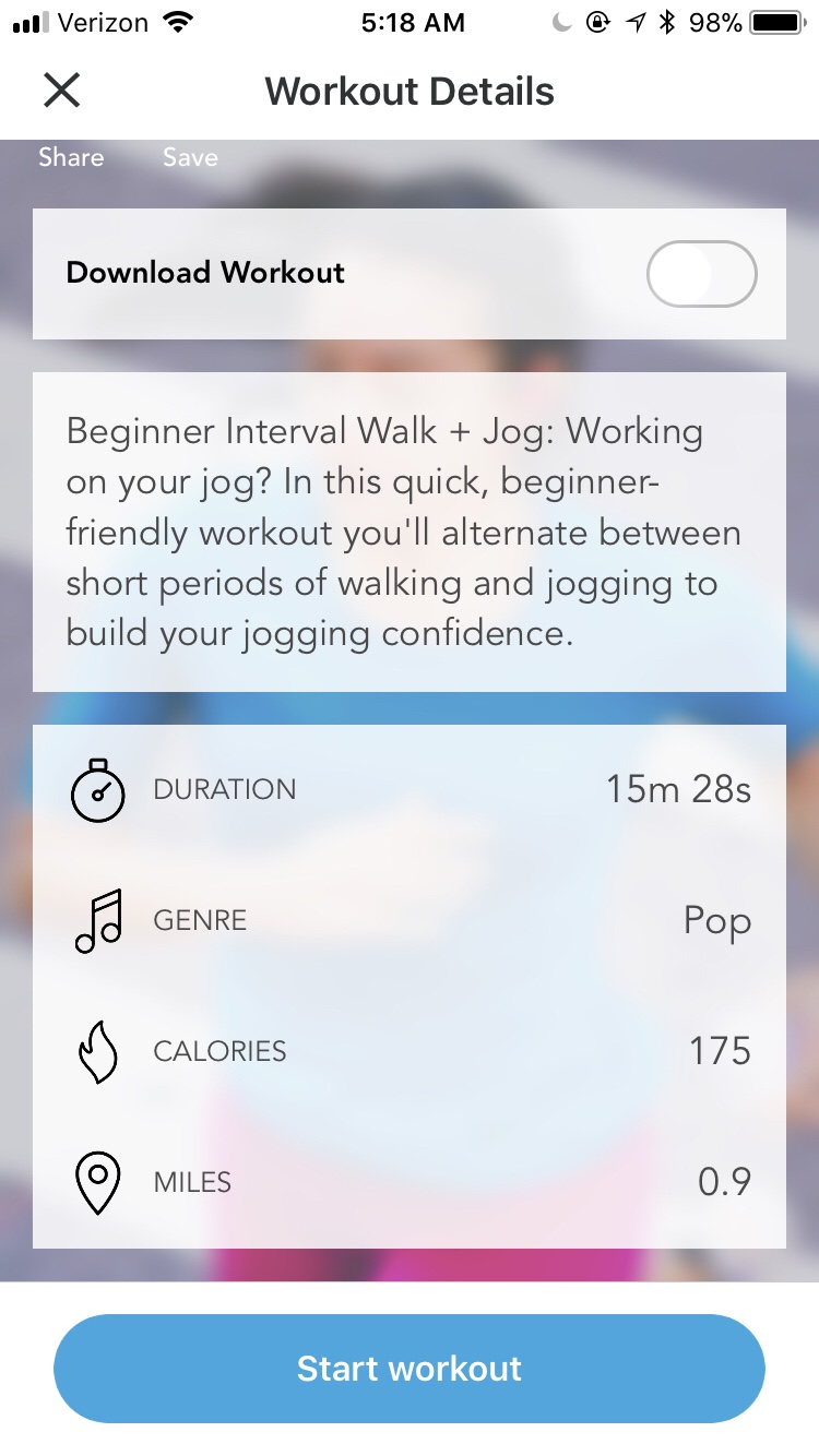 When I mean classes, it is literally you, your headphones and phone working out together. For me, I stuck to the beginner running which you can adjust to a treadmill or to outdoor running. In there, I found run-walk intervals, pure walking, and even 5K training plans. About twice a week, I try and do a weight training class, mostly bodyweight but you can find classes with or without weights that are as short as 9 minutes if that is all the time you have.